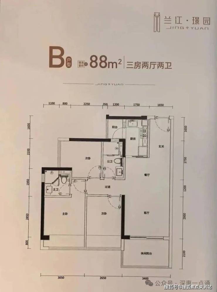 88m²的3房2厅2卫,设计的经典竖厅格局,进门入户玄关,客厅3.4米开间,LDKB一体化设计,三开间朝南,动静分区,分别做到了主卧10.98m²/次卧9.3m²/次卧6.49m²(实测面积,去掉墙体),L型厨房带1个小生活阳台1.92m²,卫生间干湿分离,得房率78.8%(不含赠送),客厅阳台7.14平东南朝向,看小区园林或比亚迪+山景。套内面积68.73m²+飘窗6.24m²+阳台4.53m²=实际套内79.5m²,加上赠送面积后得房率约90.62%。