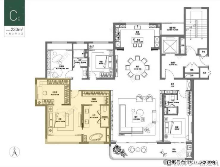 比如常州万科·瑧湾汇建面约225㎡的天幕行宫,私梯入户,首先是给足了业主尊崇感与私密性;同时也丰富了生活动线,为日常生活提供了更多样的选择方案,使用价值与情绪价值都拉满。