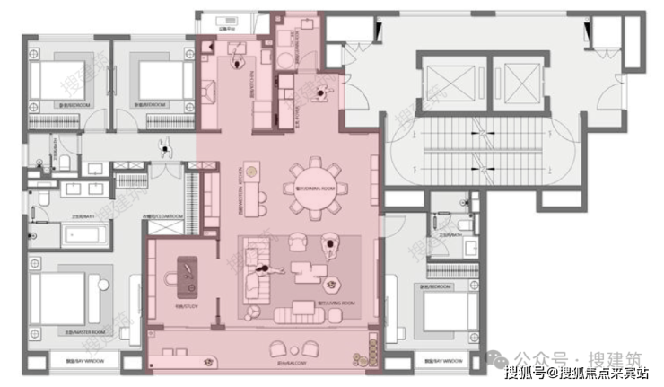四房+双行政级套房+三卫+大横厅的设计,这个户型的一大亮点是:利用角部交错咬合手法,使客厅挑高达到了惊人的约6.2米,大玻璃落地窗一气呵成。