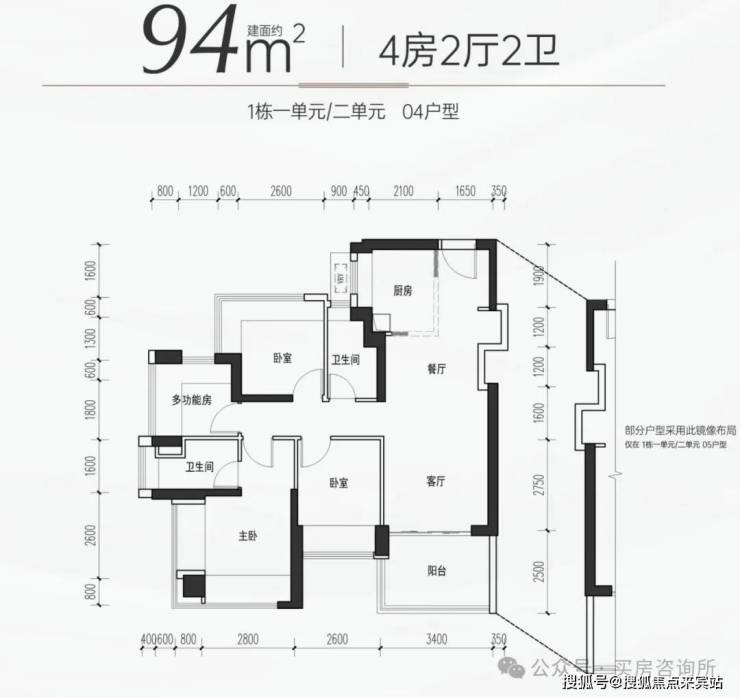 94㎡的4房2厅2卫,设计的是竖厅格局,进门独立玄关,LDKB一体化,S墙设计预留冰箱卡槽位,主卧双飘窗设计,U型厨房,卫生间干湿分离,得房率约97%(包含赠送),东南朝向。