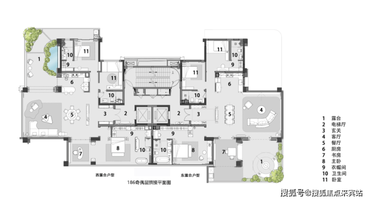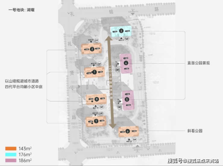 整盘定位为改善平层四代宅,产品面积段为143㎡、176㎡和186㎡。 东侧有公园视野,住宅价值最优,故176/186产品设置在东侧,露台直面公园。143产品皆临路,故以山墙规避城市道路影响,露台均朝园区中庭。