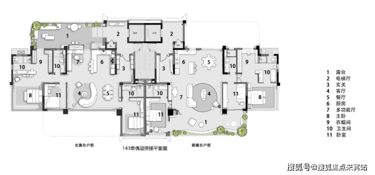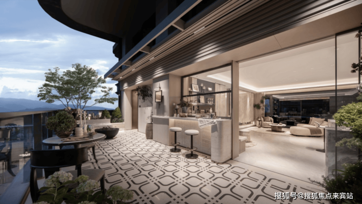 南侧露台紧邻客厅,精装展示强调视觉通透与空间展示性; 北侧露台连接多功能厅与厨房,精装则突出功能延展与场景氛围营造。
