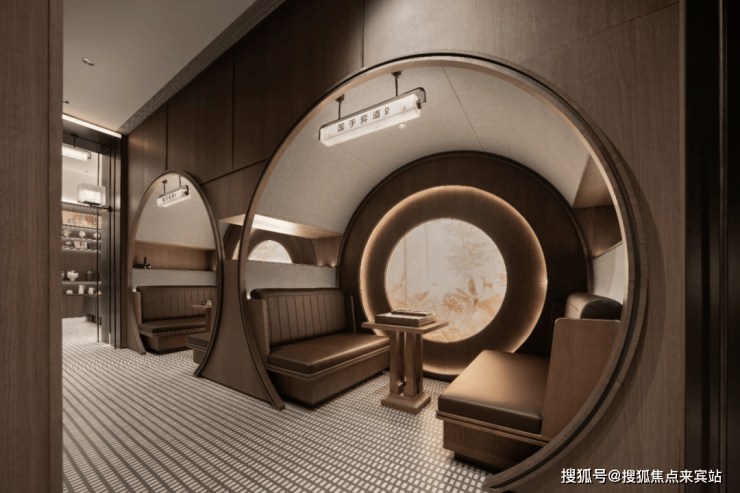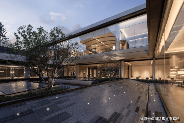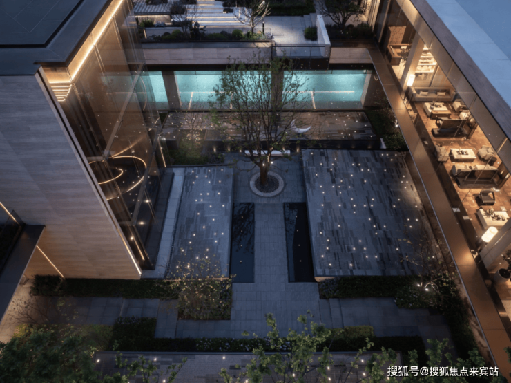 第三进的星月水院,由一座上层的行政酒廊、下沉式会所、花园厅围合一座水院而成。花园厅的悬浮顶抽解了重庆当地的文化屋檐元素,以现代化的手法演绎其特色。两侧的线条均以陶板做为主材,给人温润如玉的感受。