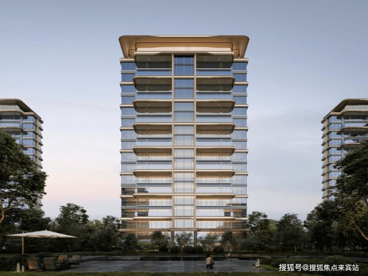 外立面风格为现代,群像天际线对话城市,空间形态对标重庆地标来福士。立面以水为魂、玉出重庆作为概念切入点,提取水与玉的温润元素符号运用到弧形的铝板线条中,类幕墙的设计,大面的玻璃与金属碰撞带来惊艳的精工感。在材质色彩方面,以香槟色对话米白色,正是金风玉露一相逢,便胜却人间无数。