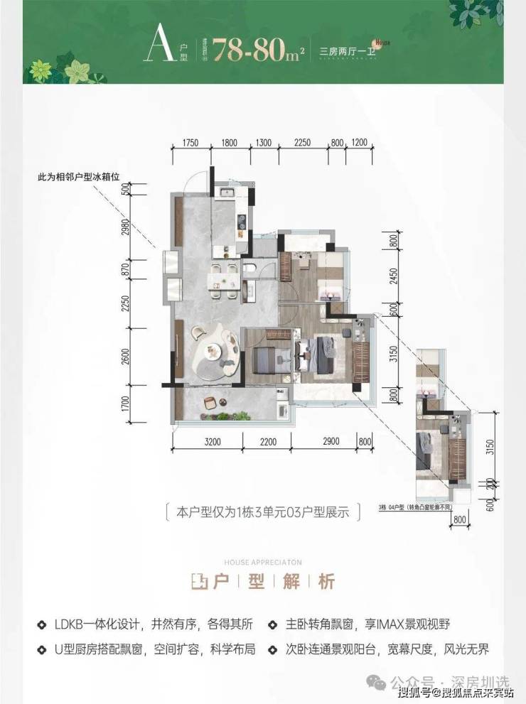 80㎡三房 一卫:约5.4m宽境阳台,三开间向阳;