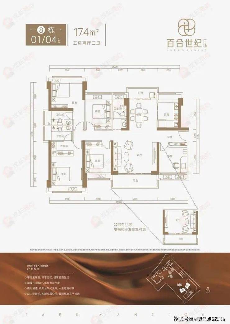 百合世纪广场主推101㎡(7栋)、102㎡(8栋)、121㎡(7栋)、174㎡(8栋)户型。其中101-102㎡户型为传统竖厅布局,东南朝向,121-174㎡户型为客餐厅独立布局,带双阳台,南北通透。