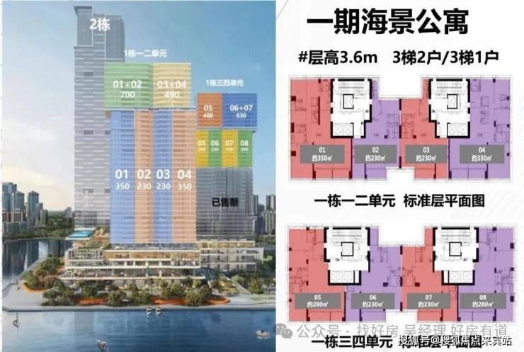 ★280㎡三房两厅四卫:位于1栋三、四单元24-32层,为05、08户型。拥有超8米超宽幕开间,厅出阳台可直面海景。采用三套房设计,主卧配备L形全景落地窗,占据270°最佳观海位。