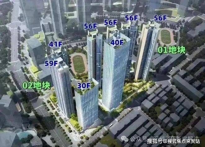 01-02地块占地约1.23万平方米,总建筑面积约15.08万平方米,计容建筑面积约10.85万平方米,容积率为8.31,绿化率为40.01%。该地块包含2栋住宅楼,分别为41层和59层,以及1栋30层的办公楼和1所9班制幼儿园。总规划1194户,住宅楼采用3梯4户设计,其中包括972套保障房。
