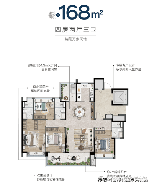 168㎡ 专梯专户,双主卧套房+7米景观阳台,电梯前厅约15㎡ 高阶改善客群