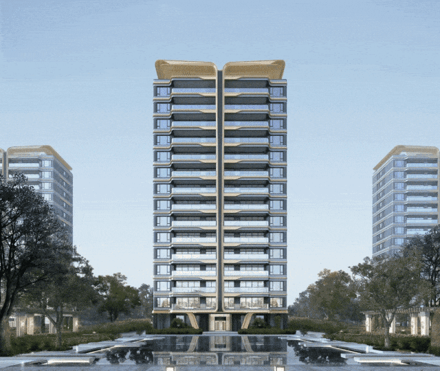 冷深灰为底,镀膜的拉通玻璃栏板体现了建筑的高级感,再加入香槟金装饰,去调和整个建筑的温度,让建筑温暖柔和,更贴近于人。