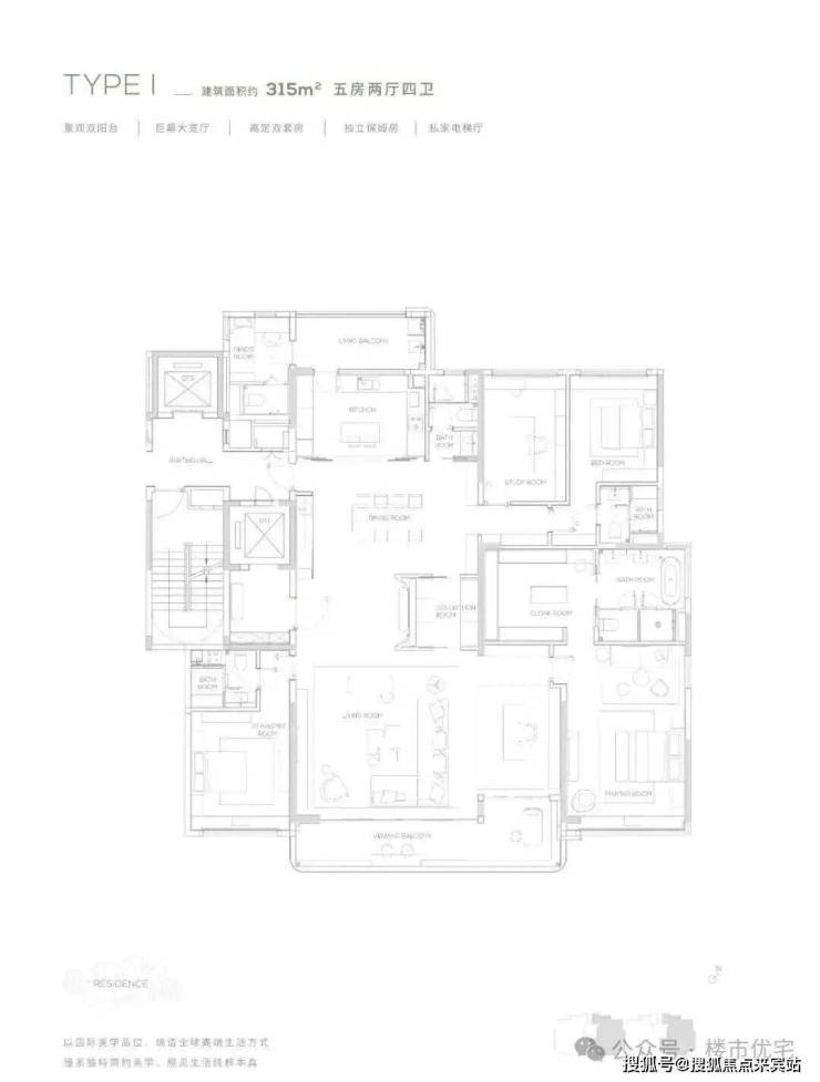 315㎡为五房两厅四卫产品,南北双阳台-独立保姆房-巨幕大宽厅-私家电梯厅