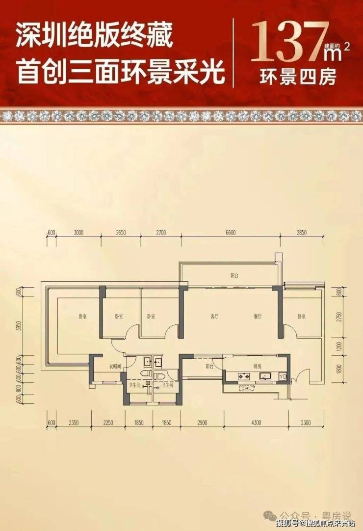 137㎡的4房2厅2卫,是大横厅双阳台南北通透格局,客餐厅6.6米开间,LDKB一体化,五开间朝南,约93%超高使用率(含赠送)