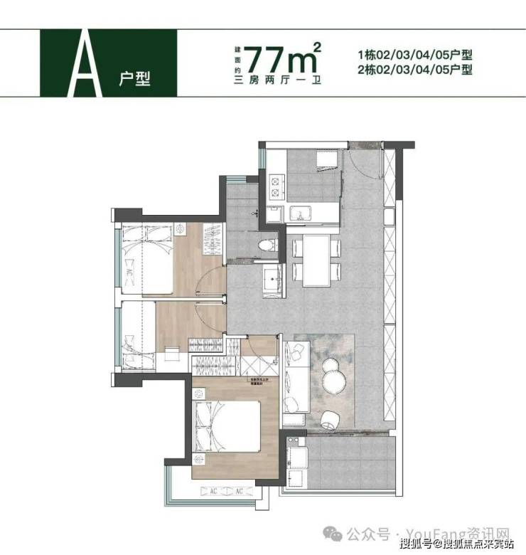 【主推产品】:74-77㎡三房一卫