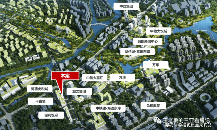 项目位于三亚市吉阳区迎宾路(海旅免税城北侧)。随着自由贸易港政策落地,在总部经济及中央商务区规划中,东岸单元作为建设大型综合消费商圈+总部经济核心区。汇集中粮、中交、保利、中航、中铁建、五矿等世界500强企业,已成为三亚城市功能上的中轴城心,凝聚着最重要的部门,昭示着三亚未来发展的方向,区域价值未来可期。