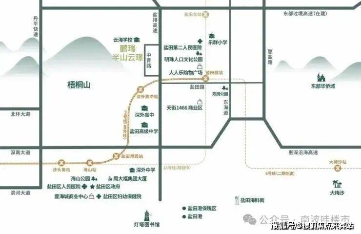 项目距8/2号线深外高中站直线距离约700m,直达罗湖福田,武深高速、惠深沿海高速、东部过境高速,盐田金色海岸码头,东部通航直升机主运行基地,执掌轨路海空多维交通,迭新城市极速生活圈。
