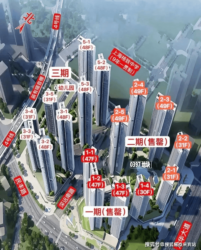 三期占地3.69万㎡,建面约21.9万㎡,容积率4.24,绿化率40%,总规划1272户,停车位1403个。 3栋1-2单元总高48层,3-5单元高31层,4栋为18班制幼儿园,5栋1-3单元总高48层。