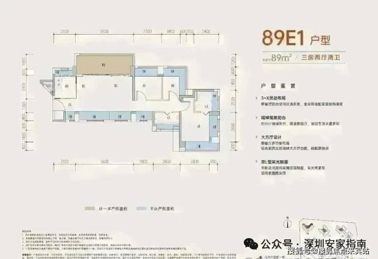 89㎡的3房2厅2卫,E1户型,设计的是横厅南北通透格局,进门入户玄关,客餐厅5.6米开间,LDKB一体化设计,客餐厅出11㎡的大阳台,主卧+1个次卧双飘窗设计,全屋12面飘窗,分别做到了主卧15.1㎡/次卧7.83㎡/次卧6.96㎡(包含墙体飘窗),L型灵动式厨房,卫生间干湿分离,得房率约:77.39%(不含赠送),阳台主朝西北向。也是可以改4房的格局,赠送面积24㎡,加上赠送得房率104.44%。