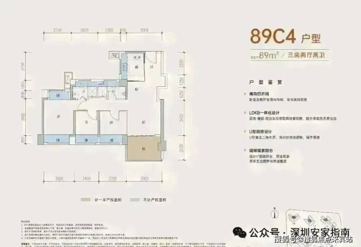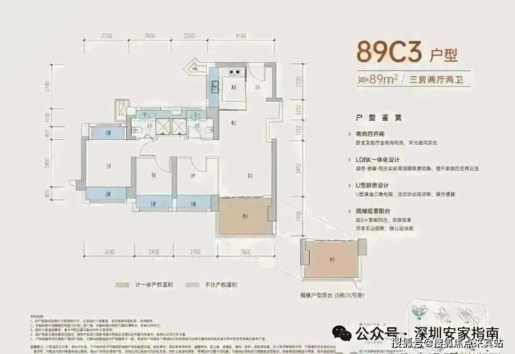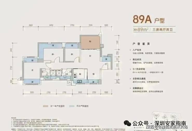 89㎡的3房2厅2卫,B户型,设计的是经典竖厅格局,进门入户玄关,客厅3.5米开间,LDKB一体化,动静分区,三开间朝南,S墙设计预留冰箱卡槽位,主卧+1个次卧270°飘窗,分别做到了主卧15.1㎡/次卧8.52㎡/次卧7.77㎡(包含墙体飘窗),U型厨房,卫生间干湿分离,得房率约:77.39%(不含赠送),西南朝向。赠送面积16.96㎡,加上赠送得房率96.84%。