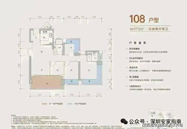 108-110㎡的4房2厅2卫,A户型,设计的是经典竖厅格局,进门入户玄关,客厅3.45米开间,LDKB一体化,S墙设计预留冰箱卡槽位,四开间朝南,动静分区,主卧+1个次卧270度大飘窗,客厅连接次卧出6米长大阳台,分别做到了主卧16.4㎡/次卧11.2㎡/次卧7.84㎡/次卧6.25㎡(包含墙体飘窗),U型厨房,卫生间干湿分离,得房率约:77.3-77.39%(不含赠送),西南朝向。赠送面积18.4㎡,加上赠送得房率94.04%。