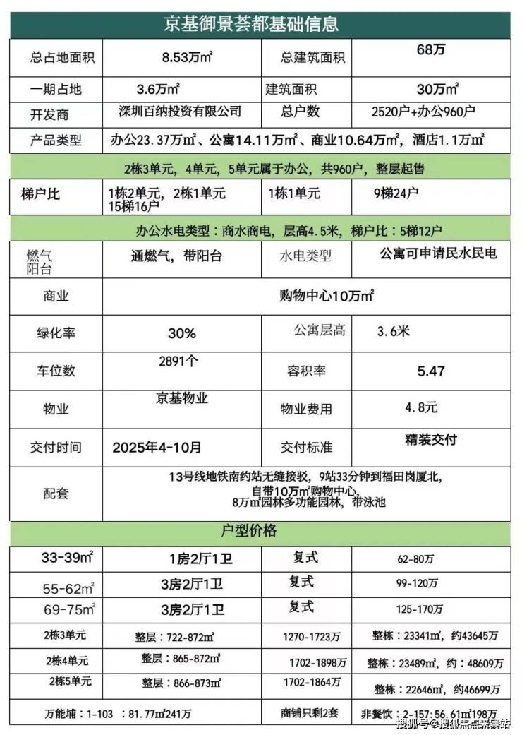 京基御景荟都分三期开发,一期是由4栋总层42-44层的公寓和3栋办公组成,一期建面30万㎡,二期三期是由学校,酒店,办公,公寓组成。