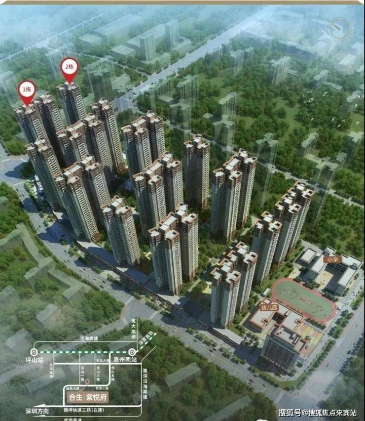 合生紫悦府项目坐落惠州大亚湾西区龙山一路与龙海三路交汇处,项目由香港上市公司合生集团开发,折也是继惠州合生滨海城、合生时代城的大亚湾区又一新品,合生紫悦府打造50万㎡的临深大盘。项目分2期开发,15栋住宅,1栋公寓,和1所小学和幼儿园,首推1-2#,主力户型88-123㎡3-4房,毛坯交付