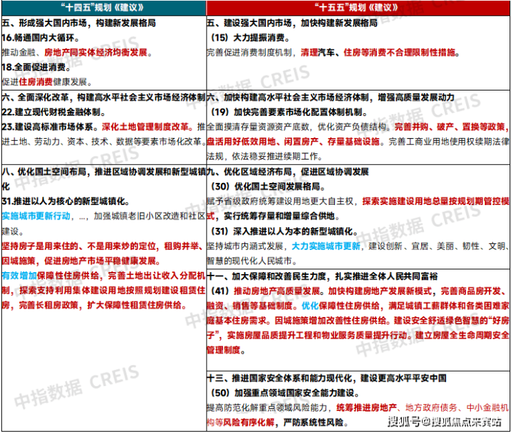 《建议》中,“坚持人民至上”上升到“十五五”时期经济社会发展必须遵循的原则,《建议》明确提出“注重在发展中保障和改善民生,在满足民生需求中拓展发展空间”,将“推动房地产高质量发展”放在“加大保障和改善民生力度,扎实推进全体人民共同富裕”,进一步了强化房地产的民生属性和在保障和改善民生中的地位,房地产高质量发展也是推进全体人民共同富裕的重要一环。