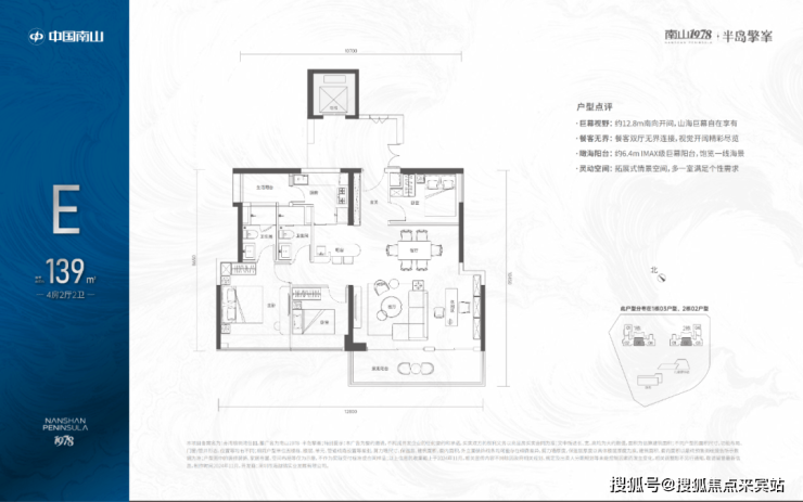 139㎡的4房2厅2卫,1栋03/2栋02高区户型,电梯入户送独立公区,设计的是竖厅类双龙抱珠格局,四开间朝南,主卧大套间设计,有1个多功能间可以做书房,6.4米长观景大阳台,L型厨房带1个生活阳台,卫生间干湿分离,得房率:72.07%(不含赠送),西南朝向。