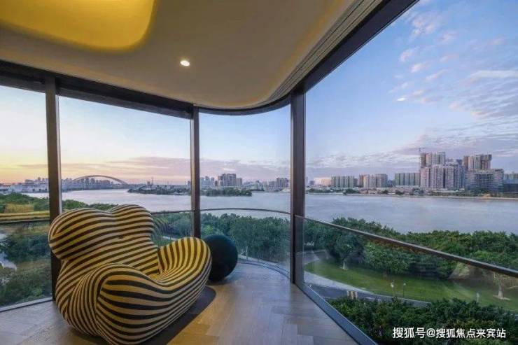 临江面采用大面积落地玻璃窗,环幕江景,270°立面转角全景落地窗,犹如海上行宫床头舱,江景视觉比客厅更佳。据闻,为了保持玻璃和石材的弧度,营造零瑕疵的天幕视野,不惜成本造价,耗费足足4个月的时间才完成安装。
