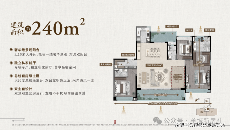 :18米一线高尔夫景观面,餐厨客一体空间超100㎡,双主套设计(主卫双台盆+明亮卫浴),总统套房级主卧,推窗即览高尔夫生态景观;