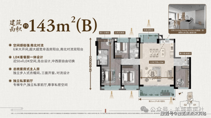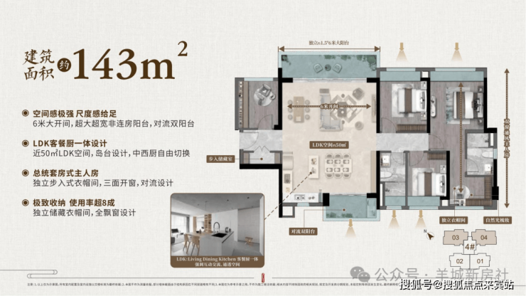 :LDK空间近60㎡(相当于市面160㎡户型尺度),配备步入式玄关储藏室、6米非连房阳台+双对流生活阳台,主卧带独立衣帽间+三窗设计,实现“143㎡享160㎡体验”;