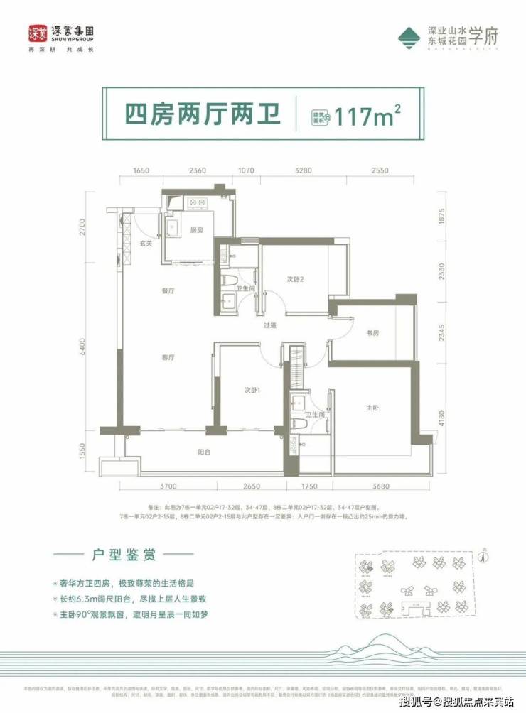 117㎡的4房2厅2卫,设计的是经典竖厅格局,进门入户玄关,客厅3.7米开间,四开间朝南,4个卧室分别做到了3.68米/2.65米/2.34米/2.33米的宽度,主卧大套间设计,客厅连接次卧出6.35米的大阳台,U型厨房,卫生间干湿分离,得房率:75%(不含赠送),东南朝向。