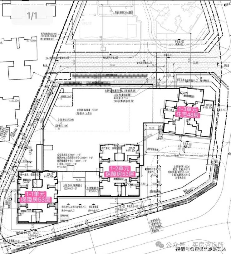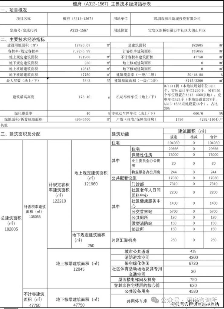 规划建设3栋(48-53层)超高层住宅,总户数1396户,其中保障房1104户,普通商品房住宅292户,机动停车位1411个。