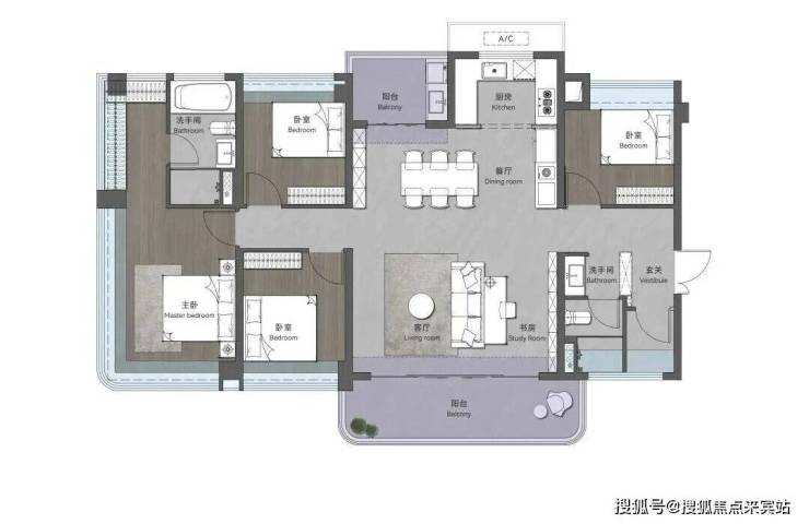 149㎡创意四房两卫,超大横厅连接环幕阳台,南北双阳台