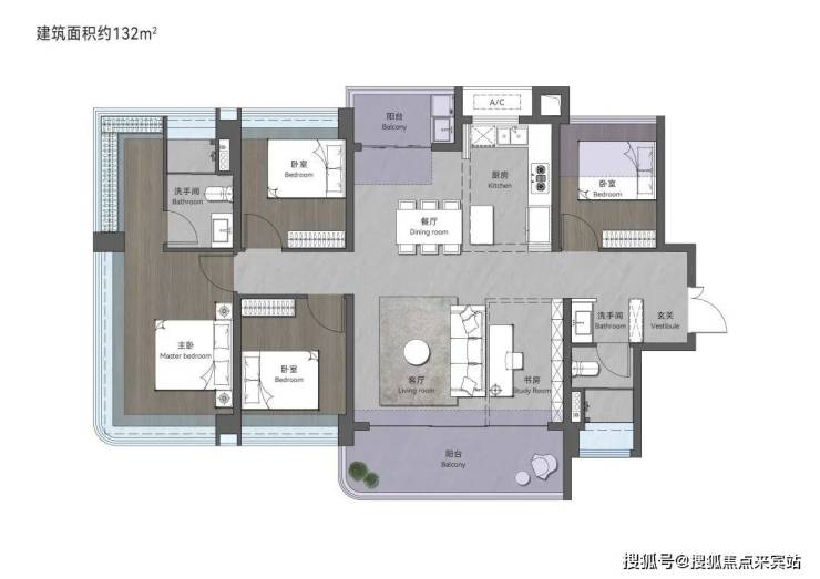 132㎡创意四房两卫,西南向,超50㎡大方厅,格局大气阔绰通透