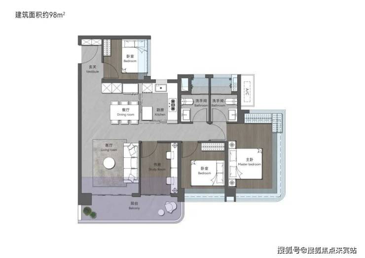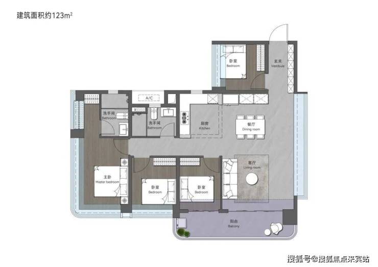123㎡创意四房两卫,约15.9m奢阔采光面,南北通透大开间,时刻享受阳光与鲜氧