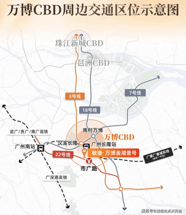 出门约800米即达22号线地铁市广路站(百度地图直线距离),1站番禺广场、2站万博中心、3站琶洲CBD、4站珠江新城;规划中26号线更是潜力可期。