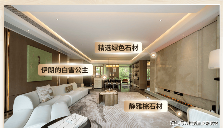 生活馆墙面为白沙米黄石,前厅地面则是尊爵蓝灰石通铺,接待台、楼梯和水吧台都是安第斯雪景石材...