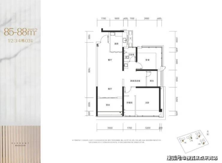 85-88㎡的3房2厅2卫,1/2/3/4栋02.03户型,设计的是竖厅格局,客厅3.5米开间,LDKB一体化设计,三开间朝南,3个卧室分别做到了主卧13.43㎡/次卧9.78㎡/次卧6.85㎡(实测面积,去掉墙体),L型厨房,公卫三段式分离,得房率约100-102.68%(包含赠送),东南或西南朝向。