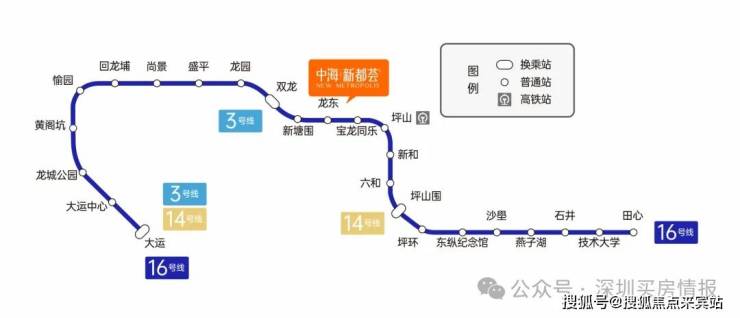 项目步行至地铁16号线龙东地铁口约50m,可通过16号线链接坪山高铁中心、龙岗中心城、大运中心
