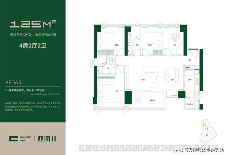 约125㎡4房2厅2卫户型:也是大横厅布局,放大了约109㎡户型的全部优点。端头位置,三面采光,四面宽朝南看海景,约12米观海面宽,海景生活更极致。