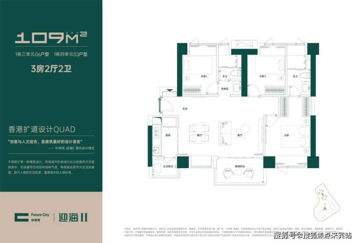 约109㎡3房2厅2卫户型:南北通透的大3房设计,大横厅布局,双面采光,四面宽朝南,具有西南向约11.2米的观海面宽。视觉与居住体验上较为舒适、阔绰!
