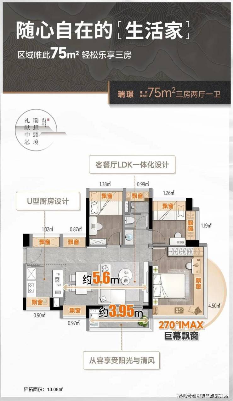 约75㎡三房两厅一卫:片区唯一75平精装大三房,客餐厨LDK一体化,户户270°豪宅飘窗,可分可合中西双厨,实用面积达103%