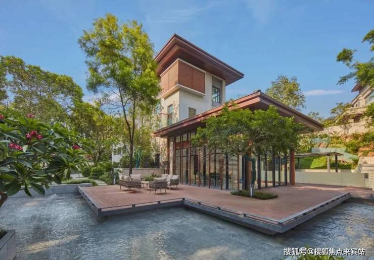 S2「盈水阁」,由设计巨擘赵红红匠心设计,整体设计以泰国普吉岛的独家酒店作为建筑创作蓝本,采用连廊、大桃檐、木制百叶窗、大量水景、泰式尖顶等元素,打造一个“东南亚风情的新现代主义建筑”。同时,根据独特地形地貌,营造出新时代精英阶层寄情山水、崇尚自然、追求静雅的空间场所,倡导“自动尊贵、享受生活”的价值观和新的生活体验。