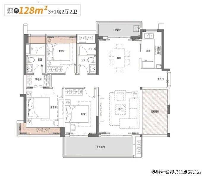 戶型動靜分區明確,打造舒適尺度雙廳、明亮闊景陽台、科學動線廚房,同時臥室均採用凸窗設計,南向主臥設有大面積的轉角飄窗,最大化採光面積和戶內的視線效果。