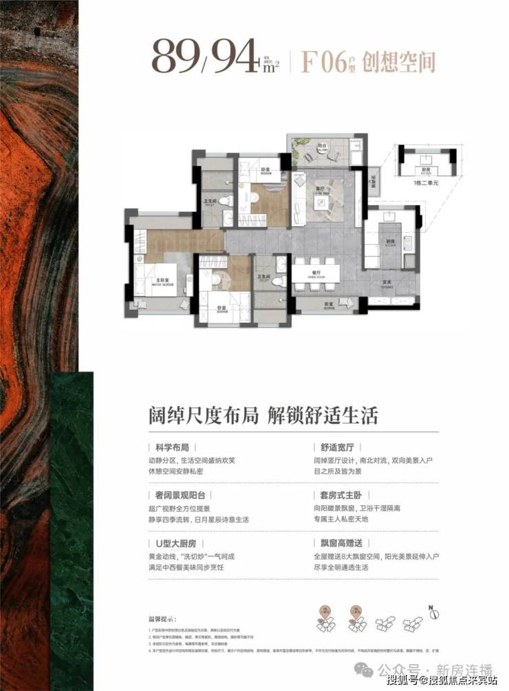 89-94平:3房2厅2卫,套内净使用率在80%,东南朝向