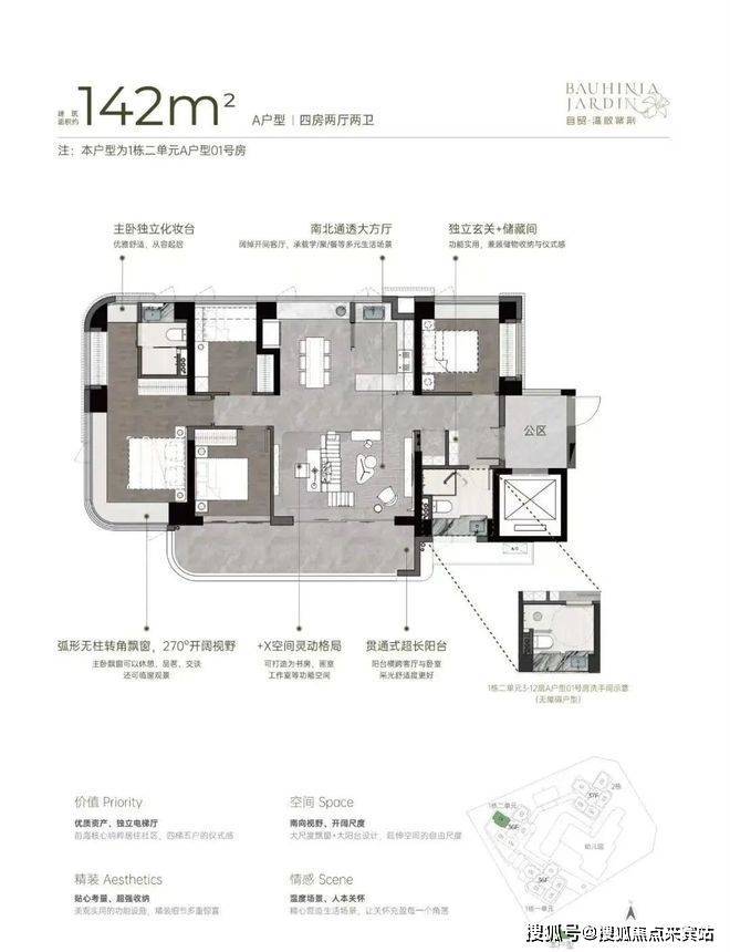 双龙抱珠户型,书房分布于客厅另一侧,且难得是双面采光+270°景观视野。主卧南北通透,且拥有十分开阔的景观面。贯通式阳台联通客厅以及靠近动区的次卧,实现长观景阳台。