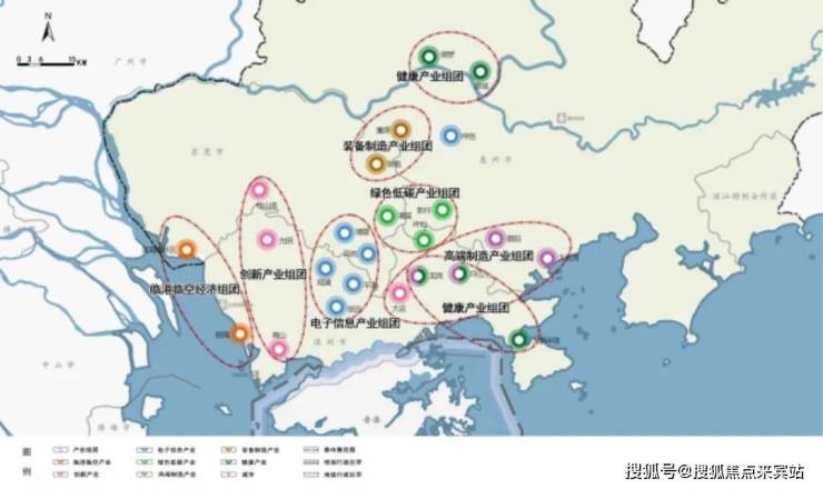 河套―西丽湖―光明―松山湖创新产业组团;前海片区―滨海湾新区―翠亨新区临港临空经济组团;坂田―观澜―塘厦―凤岗―平湖电子信息产业组团;坪地―清溪―新圩绿色低碳产业组团;潼湖―银瓶创新区装备制造产业组团;龙岗―坪山―大亚湾―惠阳高端制造产业组团;坪山―龙岗―大鹏―惠城―博罗―龙门健康产业组团