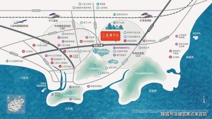 4.【城央规划 璀璨未来】项目位于迎宾路组团,集旅游、休闲、度假、养生、医疗、娱乐六维一体的综合度假区。四湾之上,三亚之心,辐射三亚湾、大东海、亚龙湾、海棠湾。