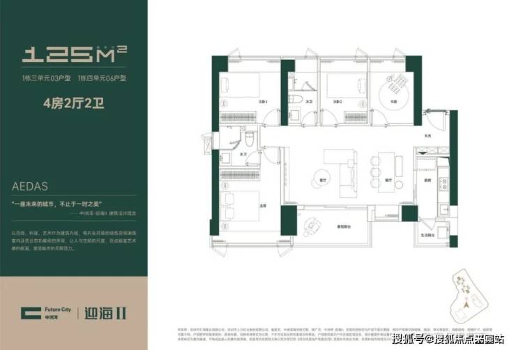 项目二期由两栋住宅楼组成,1栋1单元和1栋2单元,均为55层。1栋1单元两梯两户,都是260㎡四房三卫大平层;1栋2单元为5梯6户,户型面积为96-109-125㎡三至四房。