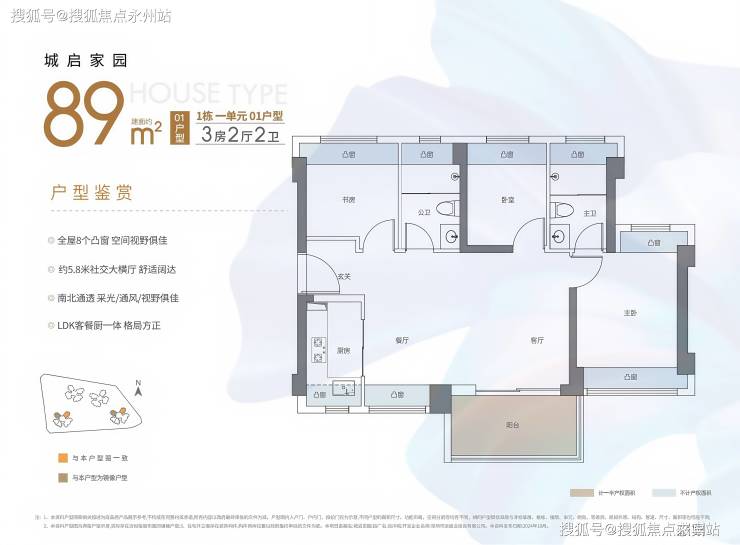 89㎡的3房2厅2卫,02.03户型,设计的是经典竖厅格局,客厅3.4米开间,LDKB一体化,S墙设计预留冰箱卡槽位,动静分区,三开间朝南,3个卧室分别做到了主卧13.79㎡/次卧7.62㎡/次卧6.93㎡(包含墙体飘窗),主卧+1个次卧270°飘窗设计,U型厨房,公卫三段式分离,客厅连接卧室出5.75米长的大阳台,得房率约87.2%(包含赠送),东南朝向。